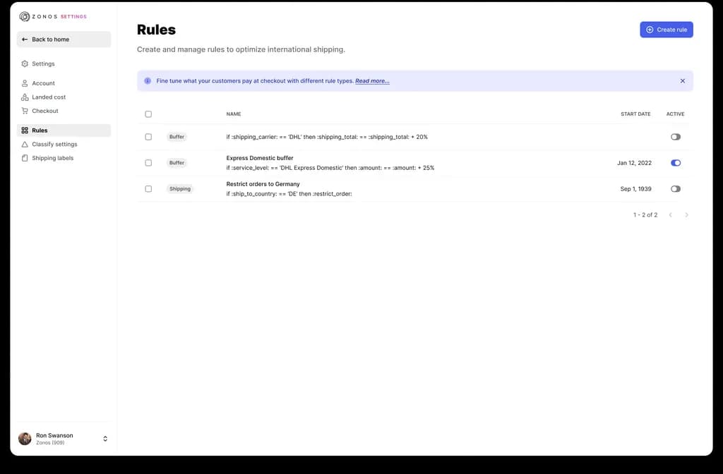 Zonos supports advanced customization of how calculations happen in your account through the use of rules. Rules can be used to add buffers to different parts of the calculation, customize fees, and more. For a full breakdown of how Zonos handles rules, including a list of all possible rule types, see our rules breakdown doc. Rules can be managed via Zonos Dashboard or through the GraphQL API.
